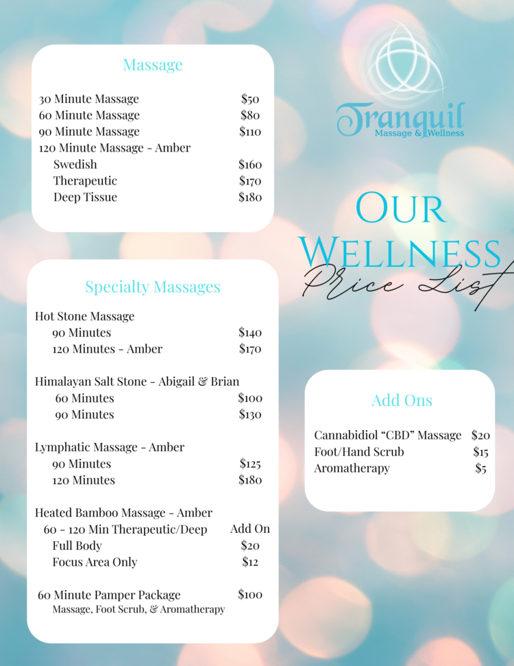 Tranquil Massage & Wellness is not only about just getting a massage, it is about bettering your own wellness, in a safe tranquil place. Where you can let go of every stress the outside world has to offer and really focus on you.